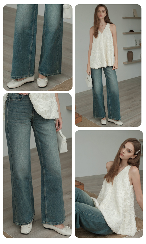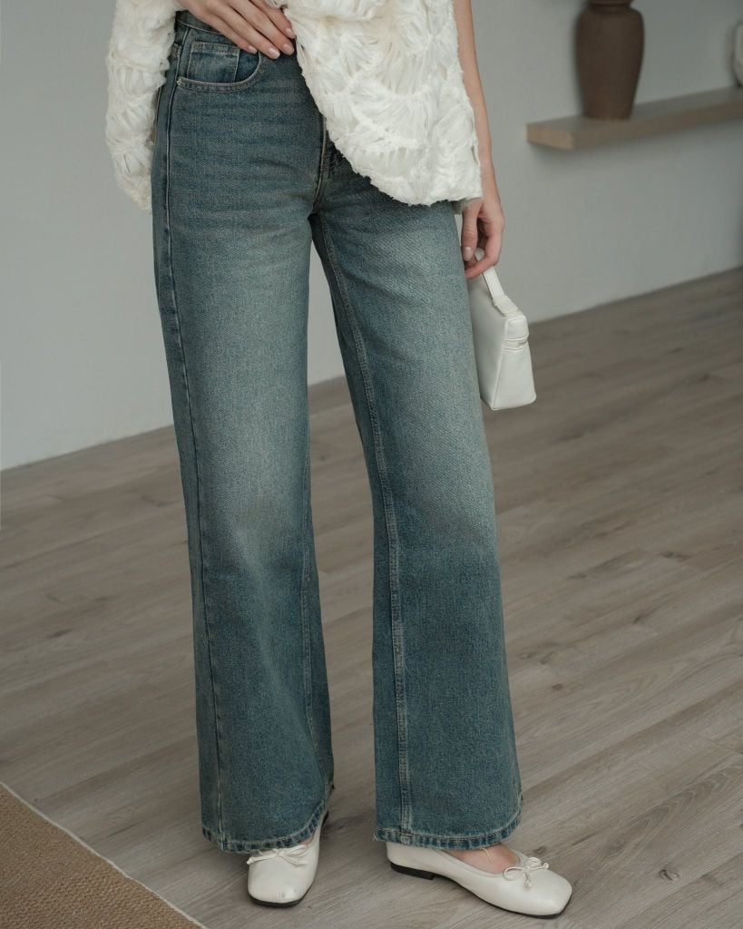 - Form sản phẩm: Quần jeans ống rộng, lưng cao giúp tôn dáng, che khuyết điểm hiệu quả, dễ dàng phối với nhiều kiểu áo từ basic đến cá tính.