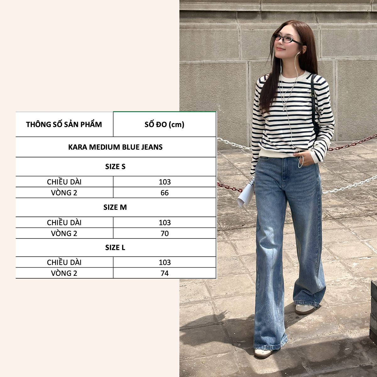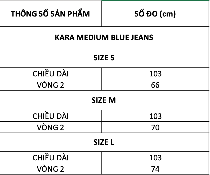 1. THÔNG TIN SẢN PHẨM (Số đo trải sàn)- Chất liệu: Jeans - Form sản phẩm: Quần jeans ống rộng, lưng cao giúp tôn dáng, che khuyết điểm hiệu quả, dễ dàng phối với nhiều kiểu áo từ basic đến cá tính. - Màu sắc: Xanh, wash nhạt ở đùi- Size: S M L - Thông số sản phẩm chi tiết:+ Size S: Chiều dài quần 103cm, eo dưới 68cm, mông dưới 91cm, đùi dưới 58cm, ống dưới 56cm+ Size M: Chiều dài quần 105cm, eo dưới 72cm, mông dưới 95cm, đùi dưới 60cm, ống dưới 58cm+ Size L: Chiều dài quần 105cm, eo dưới 76cm, mông dưới 99cm, đùi dưới 62cm, ống dưới 60cm trong quá trình sản xuất qua từng đợt sẽ...