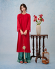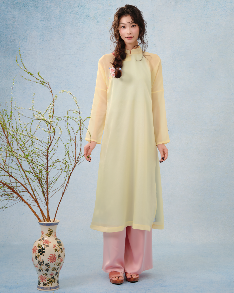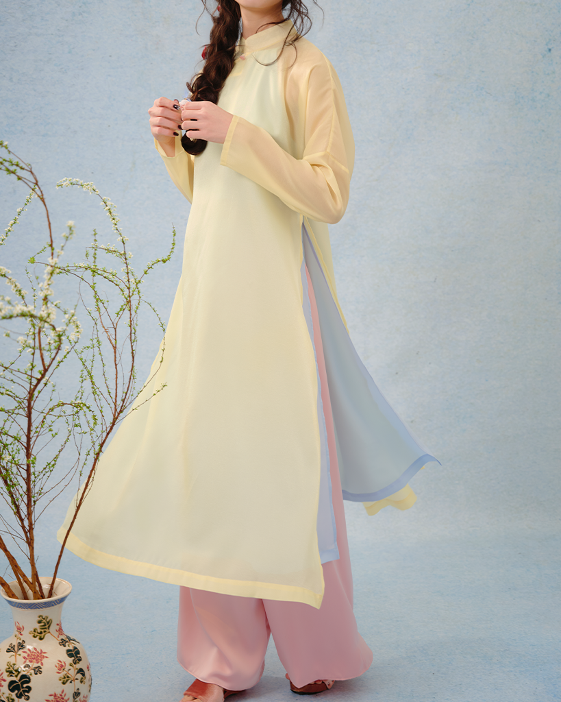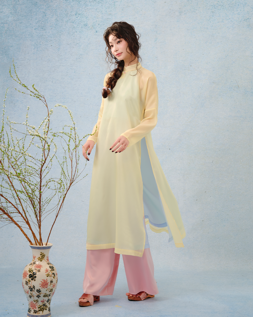 Sắc màu: Vàng mơ, Vàng nắng phối xanh trời – những gam màu tôn vinh làn da châu Á và đặc biệt phù hợp với không khí lễ hội.