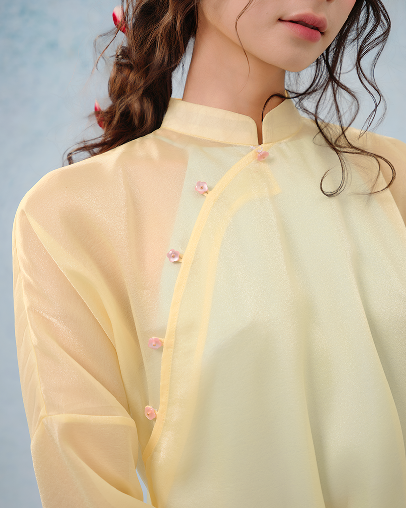 Điểm nhấn tinh tế: Cổ áo tàu thấp thanh mảnh giúp tôn lên chiếc cổ cao và bờ vai thon. Các chi tiết khuy cài được điểm xuyết khéo léo, tạo nên sự giao thoa hài hòa giữa nét cổ điển và hơi thở đương đại.