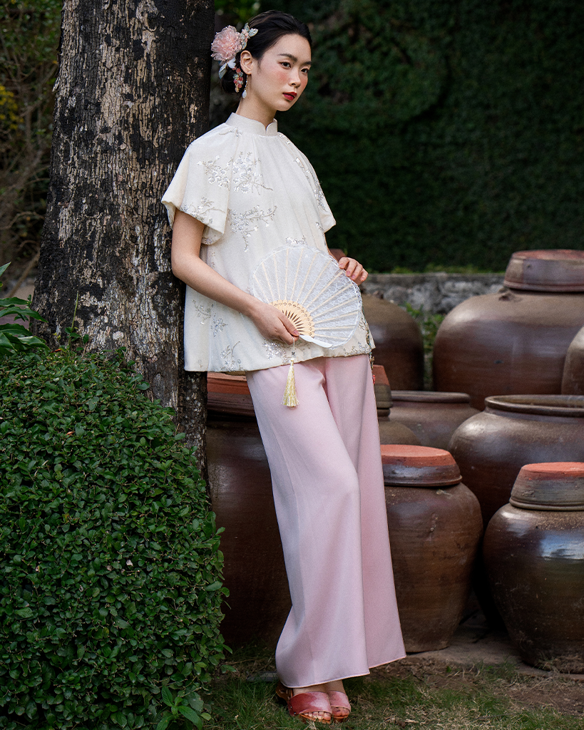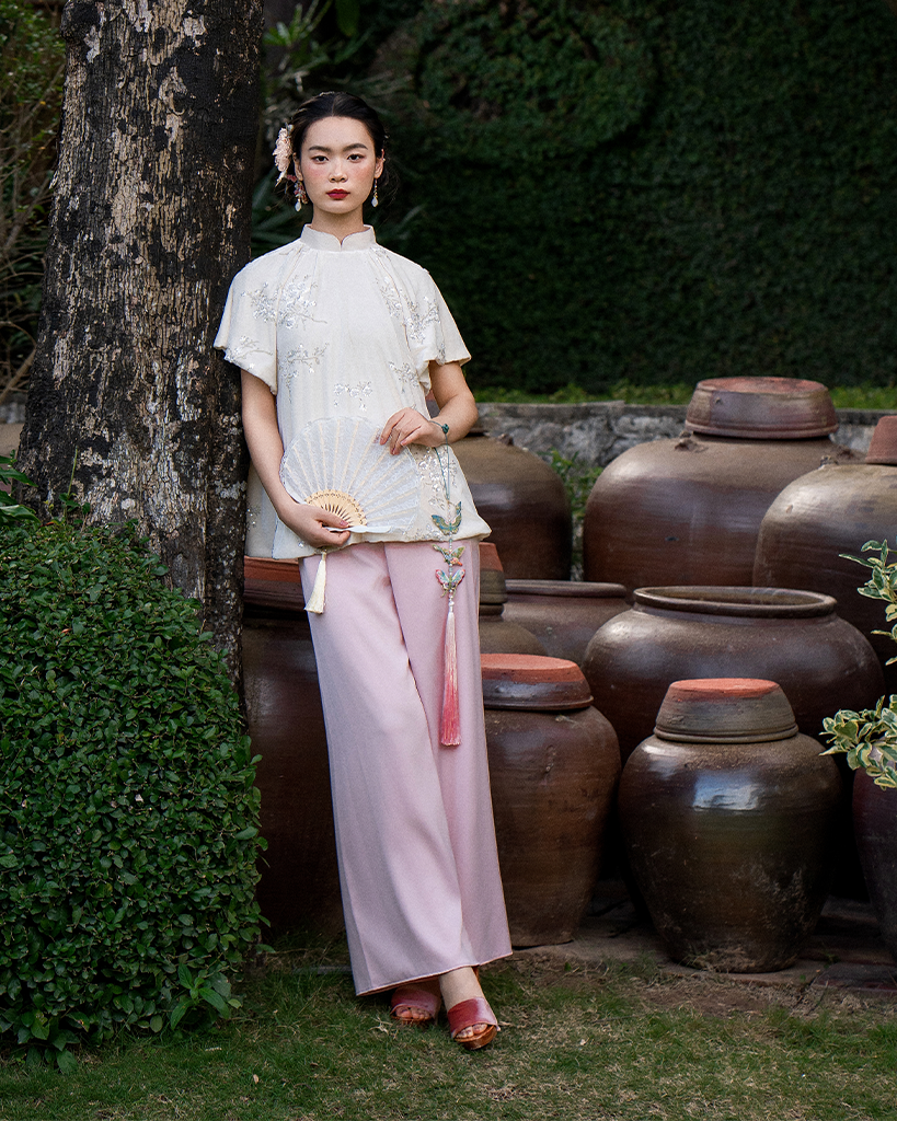 Thiết kế cổ trụ cao truyền thống được cân bằng lại bằng dáng áo suông hiện đại và tay phồng nhẹ, giúp tôn vinh đường nét gương mặt mà vẫn giữ được sự thoải mái, kín đáo. Đây là thiết kế dành riêng cho những quý cô yêu thích phong cách cổ điển đầy tinh tế.