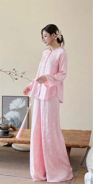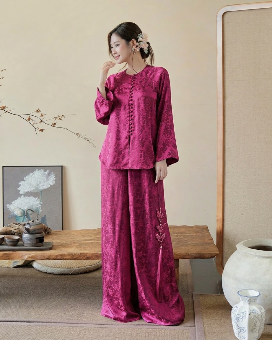 Set đồ được may từ chất liệu lụa hoặc gấm, có độ rủ mềm mại và độ bóng nhẹ tinh tế.