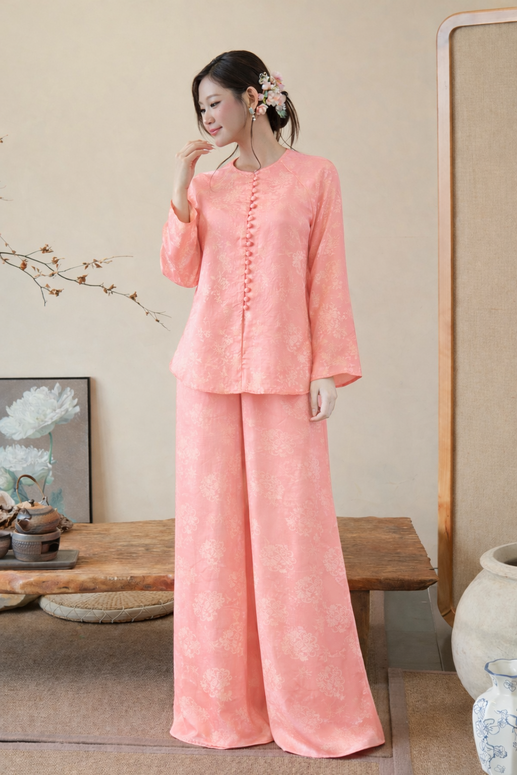 Bộ bà ba Túc Anh là một set trang phục mang vẻ đẹp ngọt ngào, nữ tính và hoài cổ. Với sắc hồng phấn nhẹ nhàng cùng chất liệu lụa/gấm cao cấp, bộ đồ này là lựa chọn tuyệt vời để mang lại sự tươi tắn và thoải mái trong các hoạt động du xuân và lễ hội.