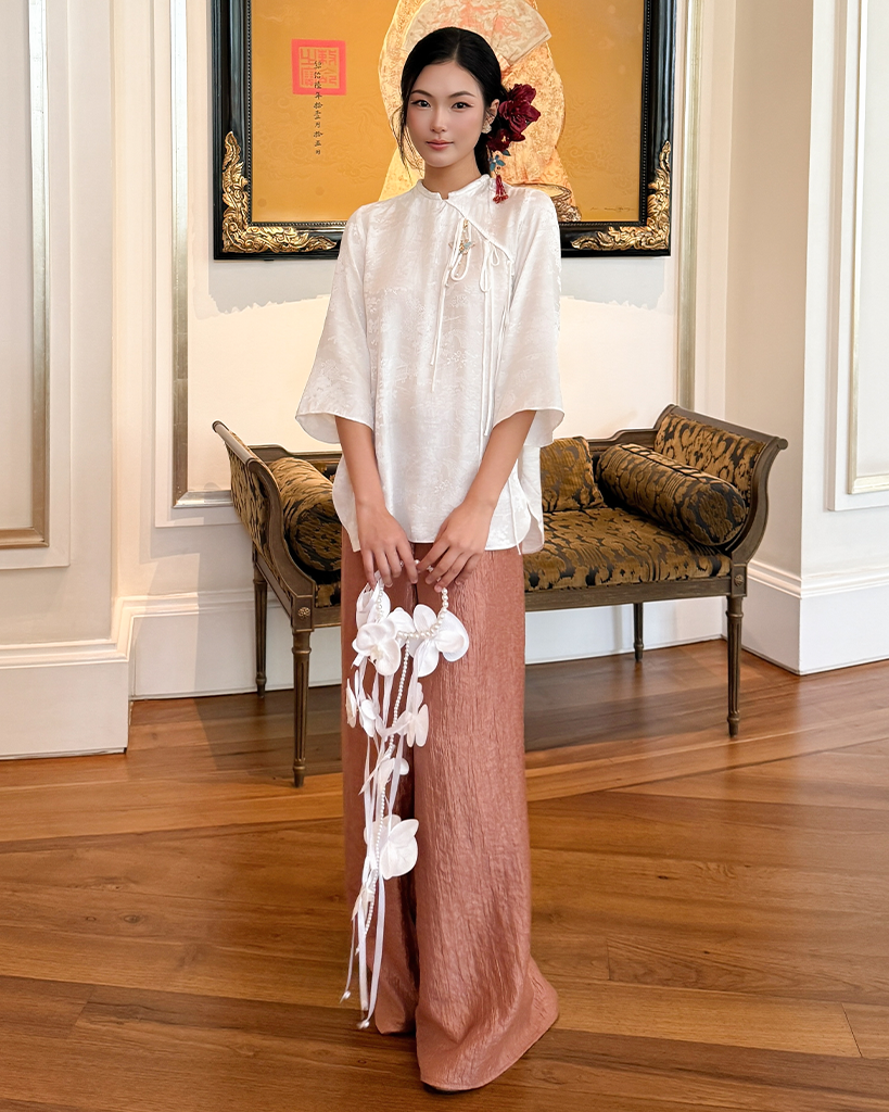 Phong Cách Nền Nã: Áo Bạch Sương mang đến vẻ đẹp hoài cổ, nền nã, rất phù hợp khi kết hợp cùng quần lụa ống rộng màu đất nung (như ảnh), màu nâu trầm, hoặc các tông màu pastel khác.