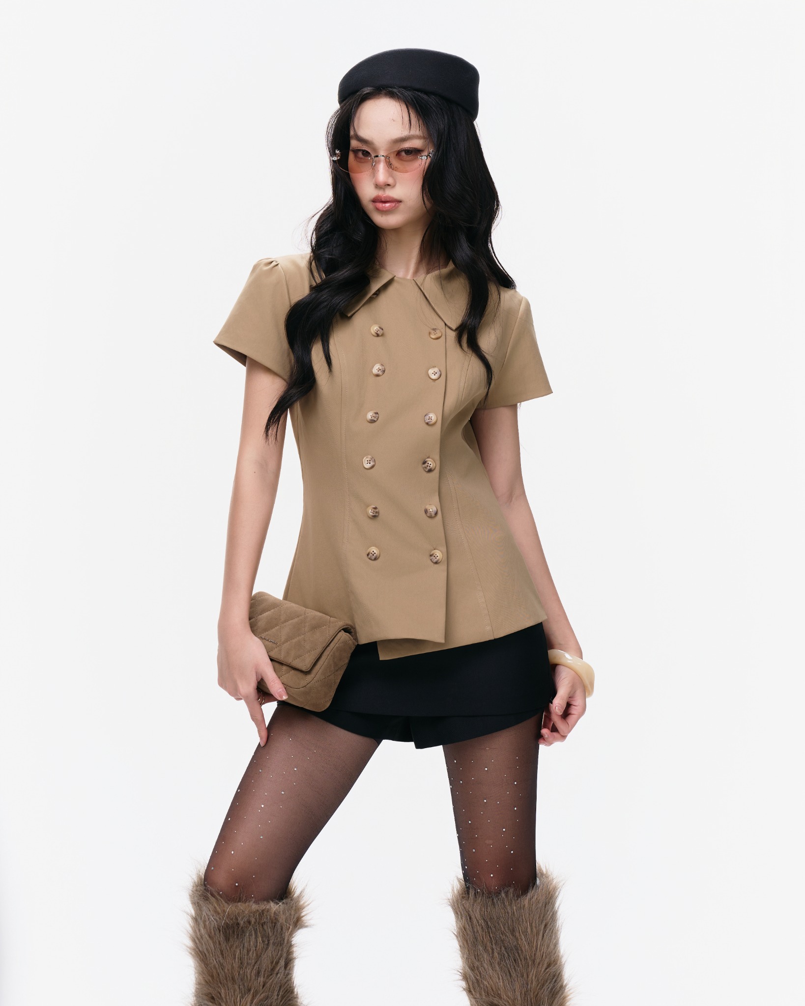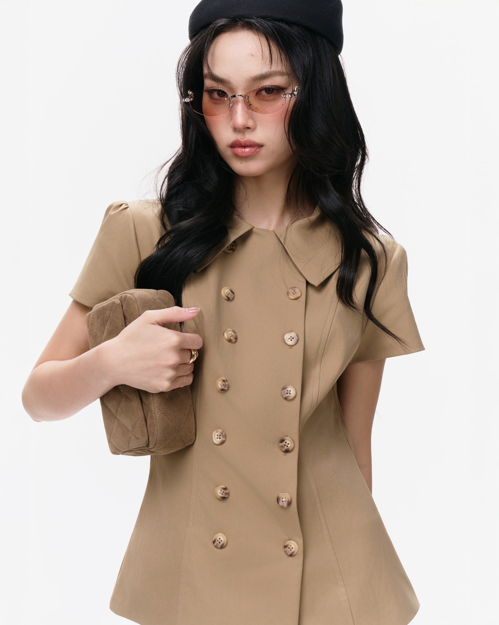 Điểm nhấn chính là hàng cúc đôi (double-breasted) lớn màu be/nâu đậm chạy dọc thân áo, tạo vẻ ngoài lịch thiệp, cổ điển như một chiếc blazer lửng. Áo có tông màu Nude/Be/Nâu Trầm, dễ dàng phối cùng quần short hoặc quần culottes để tạo set đồ công sở hoặc dạo phố sang trọng, thời thượng. Sản phẩm có sẵn Size S, M.