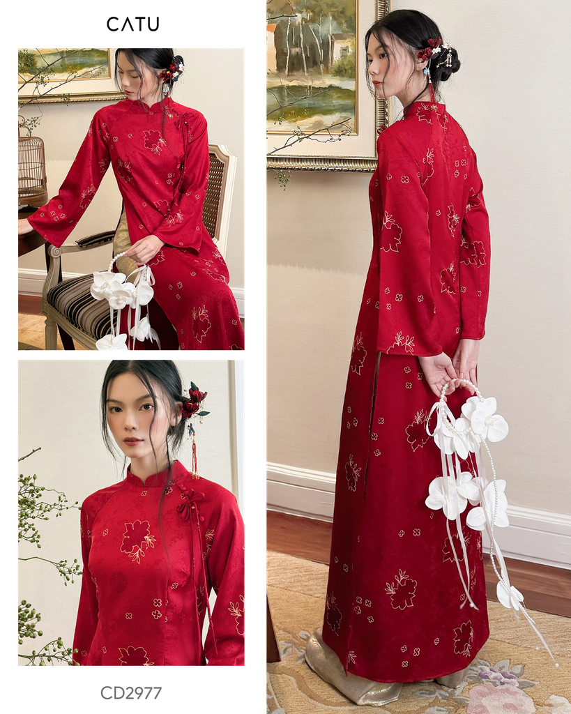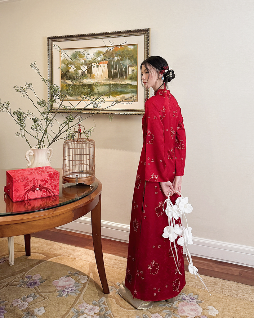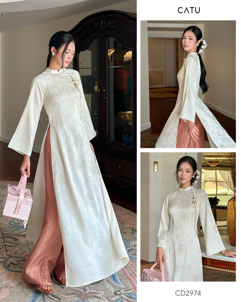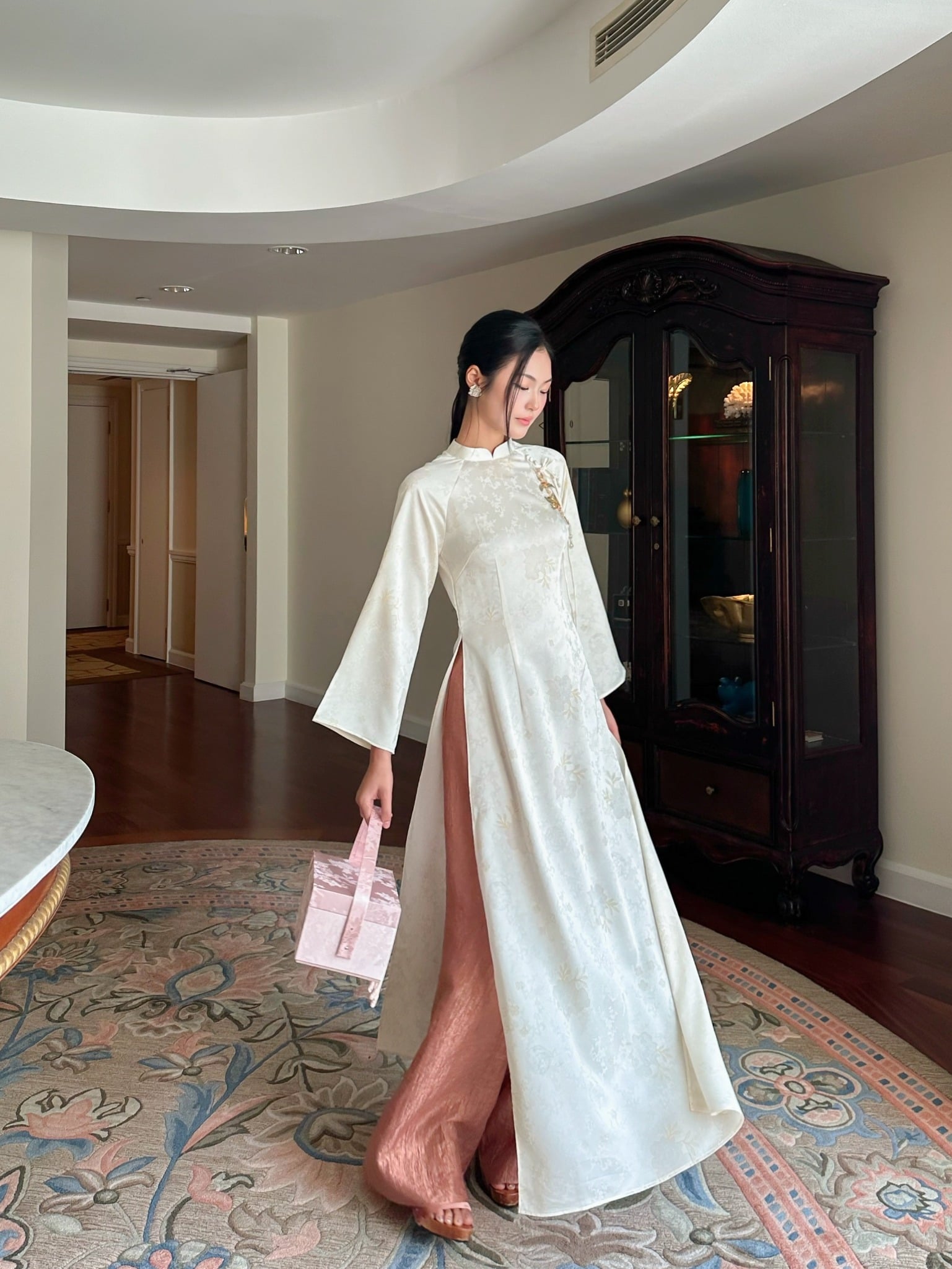 - Chất liệu cao cấp: Áo được may từ chất liệu gấm dệt hoa chìm tinh tế, tạo độ đứng dáng vừa phải mà vẫn giữ được sự mềm mại, thướt tha. Bề mặt vải óng ả nhẹ nhàng, tôn lên vẻ sang trọng, quý phái.
