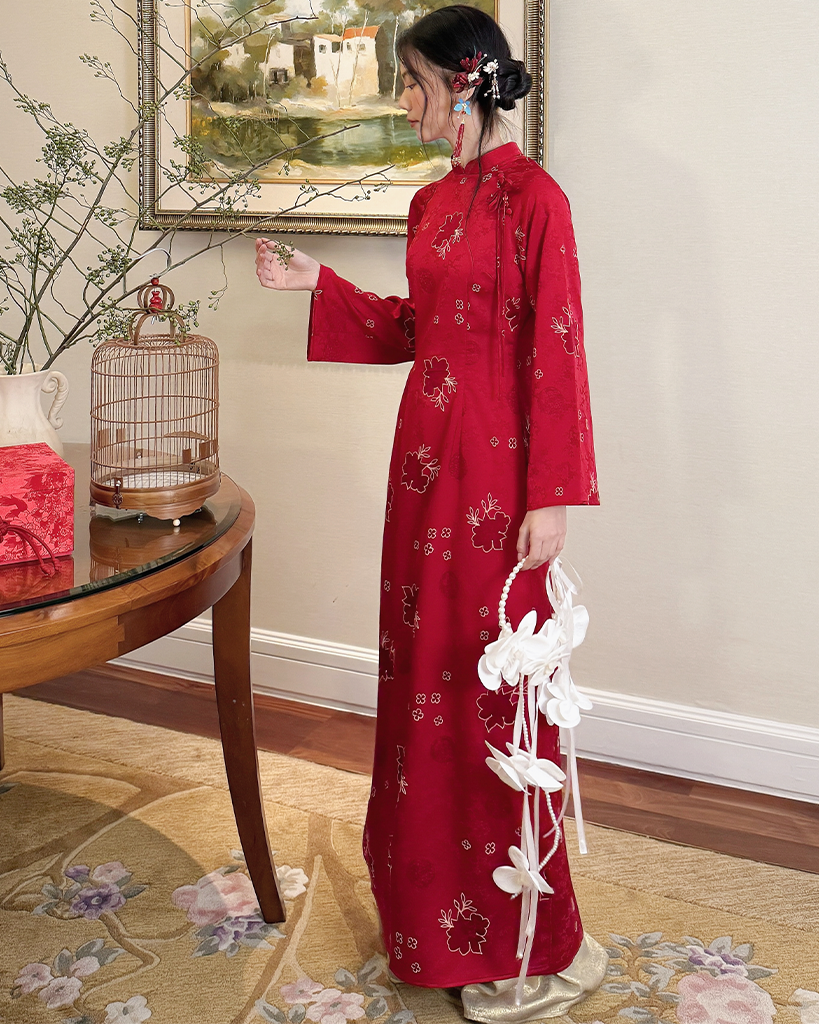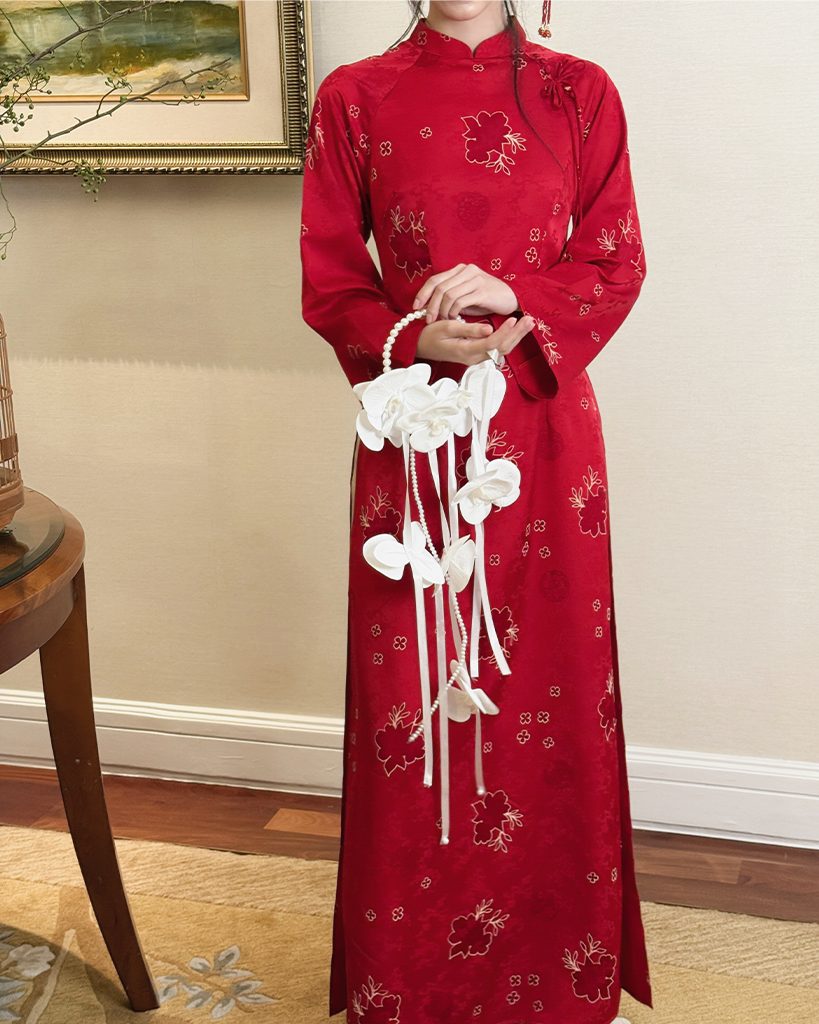 - Họa tiết thêu/dệt nổi bật: Những đóa hoa rực rỡ được thêu/dệt nổi trên nền vải, tạo điểm nhấn nghệ thuật, khiến chiếc áo dài càng thêm phần sinh động và duyên dáng.