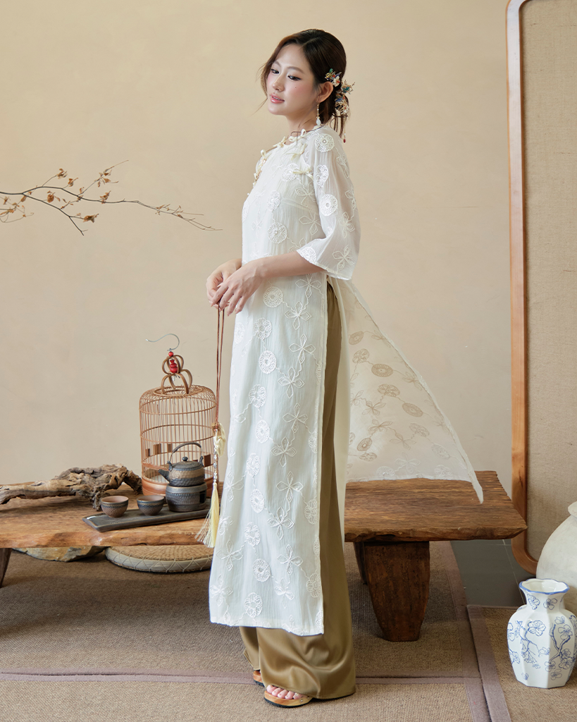 Áo dài Nhã Vân là hiện thân của sự duyên dáng, thanh thoát và nền nã. Chiếc áo dài này nổi bật với chất liệu ren/lưới thêu hoa tinh xảo, mang lại vẻ đẹp bay bổng và lãng mạn, rất thích hợp cho những ngày du xuân hay sự kiện cần sự trang nhã.