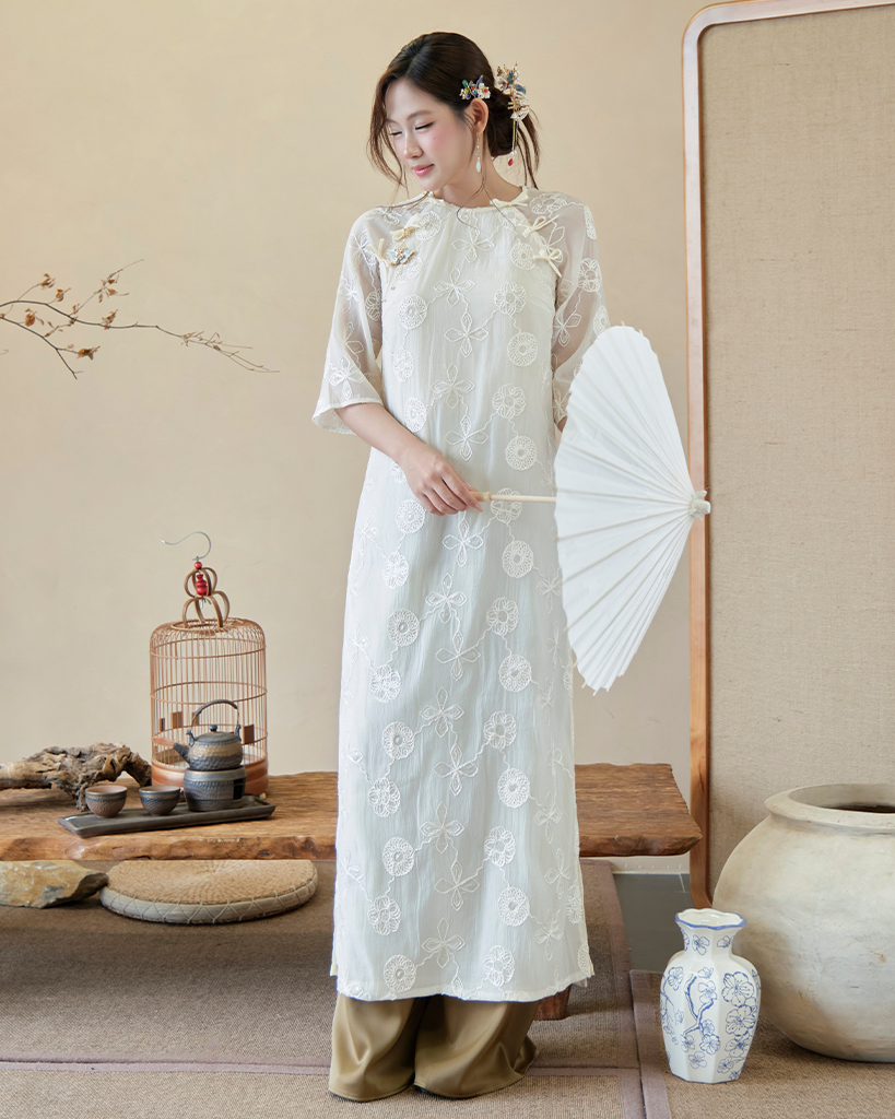 Cổ Áo: Thiết kế cổ tròn, hoặc cổ trụ thấp, đơn giản, thường có điểm nhấn là nút thắt vải hoặc hoa nổi nhẹ nhàng ở cổ.