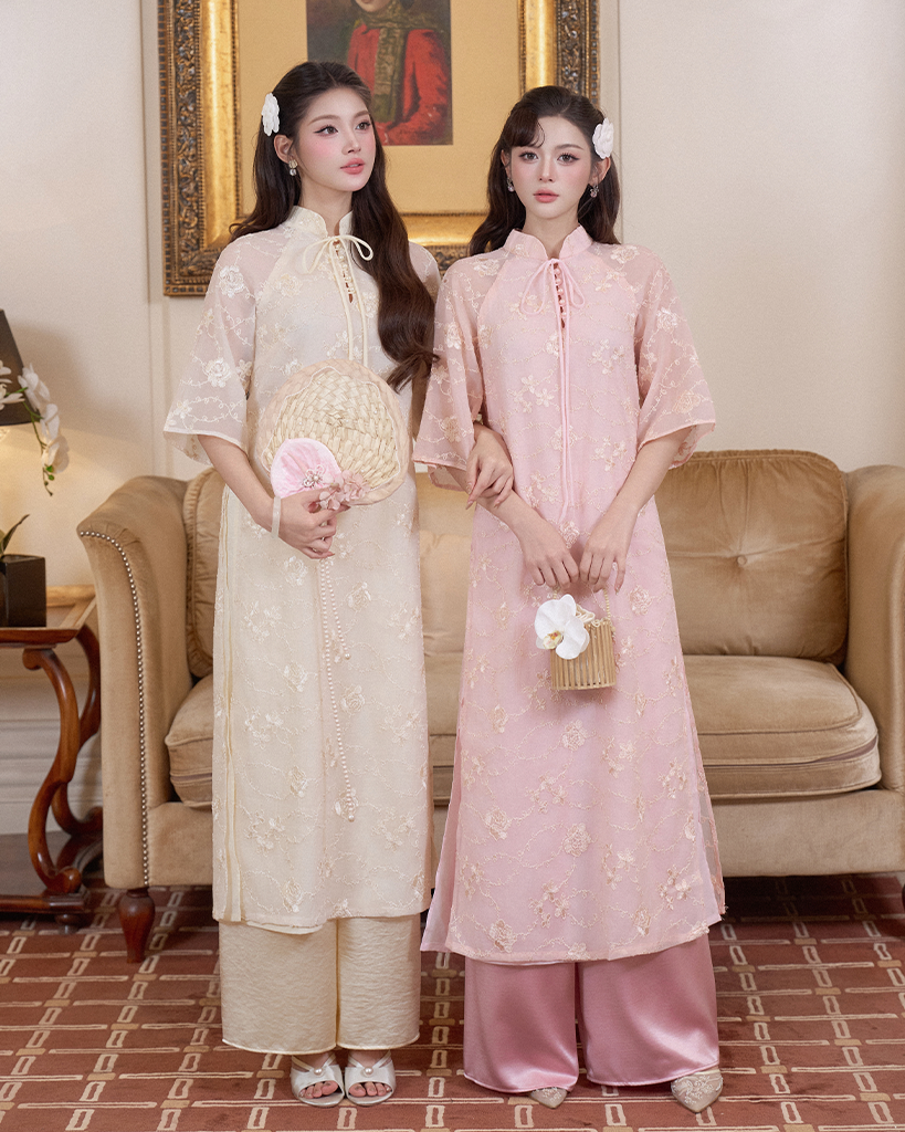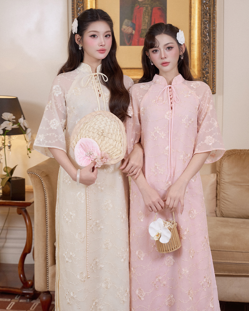 Điểm Nhấn Tinh Tế: Hàng nút thắt thủ công hoặc nút ngọc trai dọc theo tà áo tạo nên điểm nhấn nhẹ nhàng nhưng đầy sức hút.