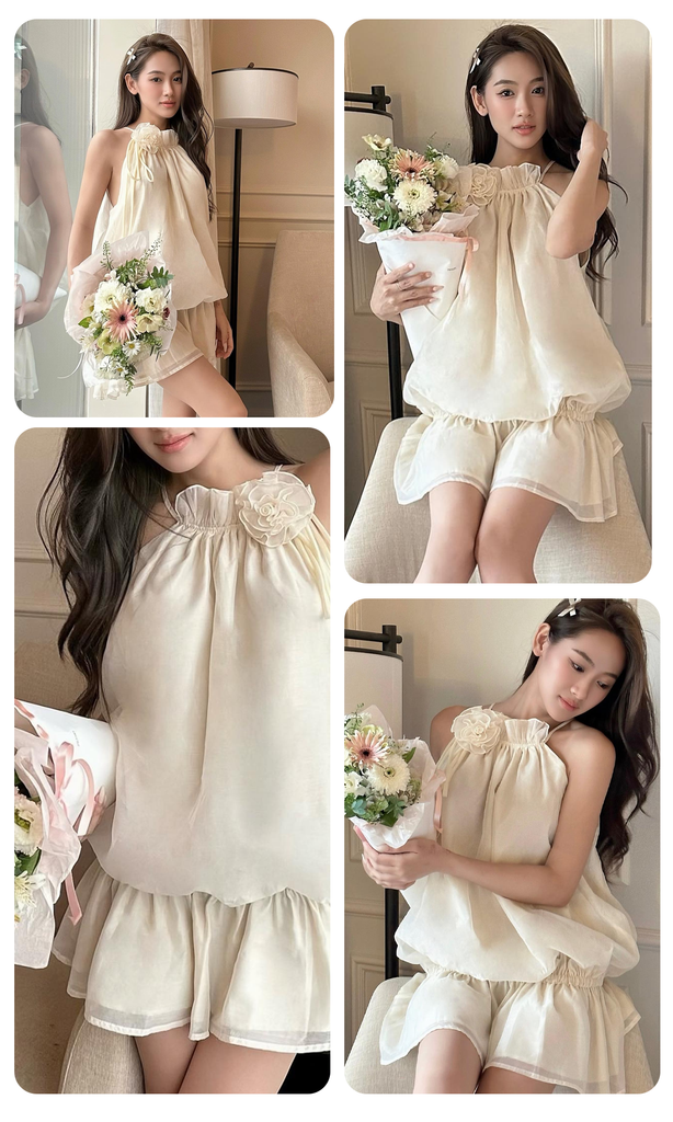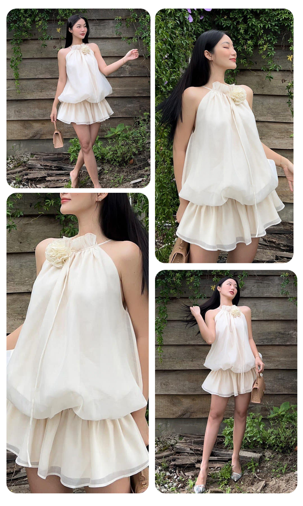 Thiết kế: Áo cổ yếm cách điệu với phần cổ nhún bèo, điểm xuyết bằng một bông hoa cùng màu được làm thủ công tỉ mỉ. Dáng áo bo gấu (bubble top) tạo độ phồng tự nhiên, giúp che khuyết điểm vòng 2 cực tốt.