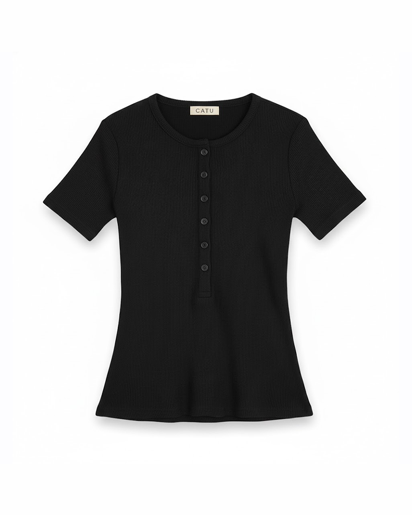 Điểm nhấn chính là hàng cúc dọc thân áo (Henley top style), tạo nét tinh tế và giúp người mặc tùy chỉnh độ hở của cổ áo. Thiết kế cổ tròn, tay ngắn đơn giản, dễ dàng phối cùng quần jeans hay chân váy mini. Sản phẩm có tông màu Đen (Black) cơ bản và đủ Size S, M, L.