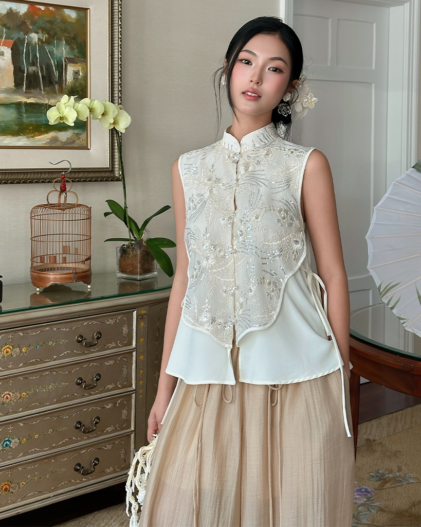 - Dáng Áo Yếm Cách Tân: Áo có phom dáng gile/sát nách (sleeveless) hiện đại, nhưng vẫn giữ được nét kín đáo, duyên dáng với cổ áo đứng cao và hàng cúc cài tinh xảo (cúc tàu/cúc bướm) phía trước, gợi nhớ đến tà áo dài truyền thống.