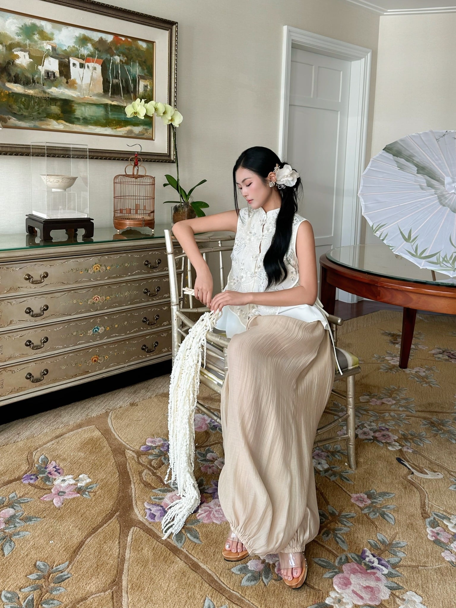 Phụ Kiện đi kèm: Hoàn hảo khi phối cùng trâm cài tóc hoa, quạt tròn hoặc túi đính ngọc trai.