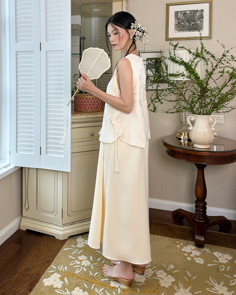 Thiết kế: Cổ áo đứng cao (cổ Tàu) kín đáo, tôn lên chiếc cổ thon thả. Thiết kế sát nách (gile) hiện đại, phối với tà áo xòe nhẹ phần eo, giúp tạo dáng thon gọn và uyển chuyển cho tổng thể. Đặc biệt, dải thêu họa tiết chim phượng hoặc cành hoa mai dọc thân áo tạo điểm nhấn độc đáo, mang ý nghĩa may mắn, cao quý.