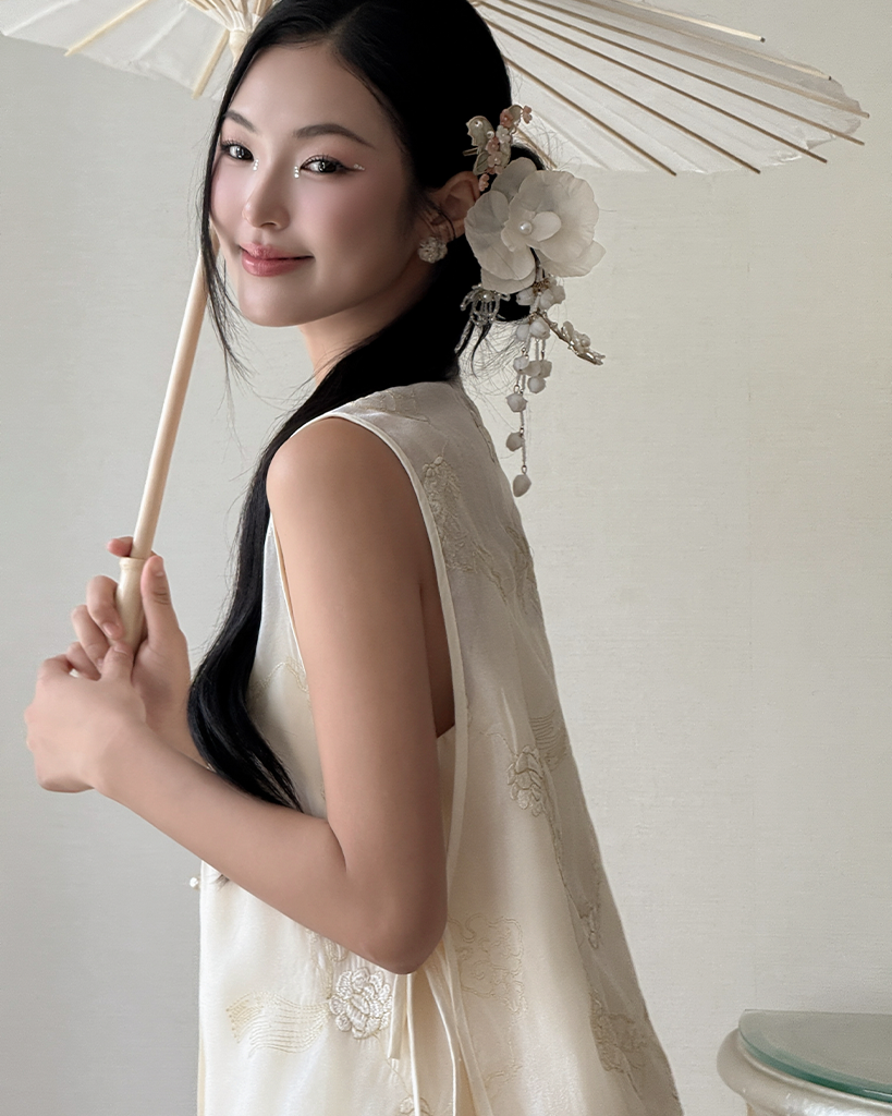 - Chất liệu: Vải tơ lụa mỏng nhẹ, xuyên thấu nhẹ nhàng, tạo độ bay bổng, lãng mạn. Họa tiết: Thêu hoa tinh xảo và đối xứng trên thân áo, gợi nhớ đến trang phục cổ trang truyền thống.