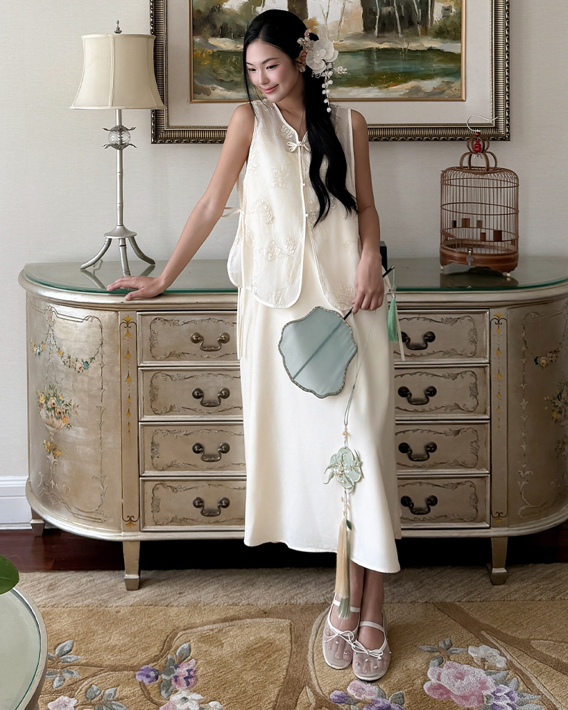 Vibe Cổ Trang Lãng Mạn: Sự kết hợp của hai lớp vải lụa và tơ thêu khiến Set Lan Chi trở nên bay bổng, rất phù hợp cho những buổi chụp hình áo dài cách tân hoặc trang phục dạo phố mang hơi hướng hoài cổ (vintage).