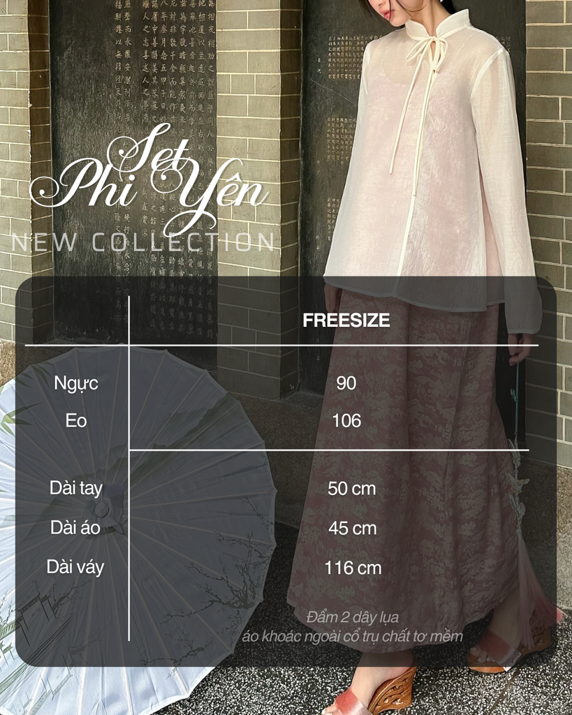 Set Phi Yên là hiện thân của vẻ đẹp nhẹ nhàng và thanh khiết. Với thiết kế chú trọng vào độ rủ của chất liệu và phom dáng phóng khoáng, set đồ mang lại cho người mặc cảm giác tự do, thướt tha như cánh chim yến giữa mùa xuân, hoàn hảo cho những chuyến du xuân hay dạo phố.